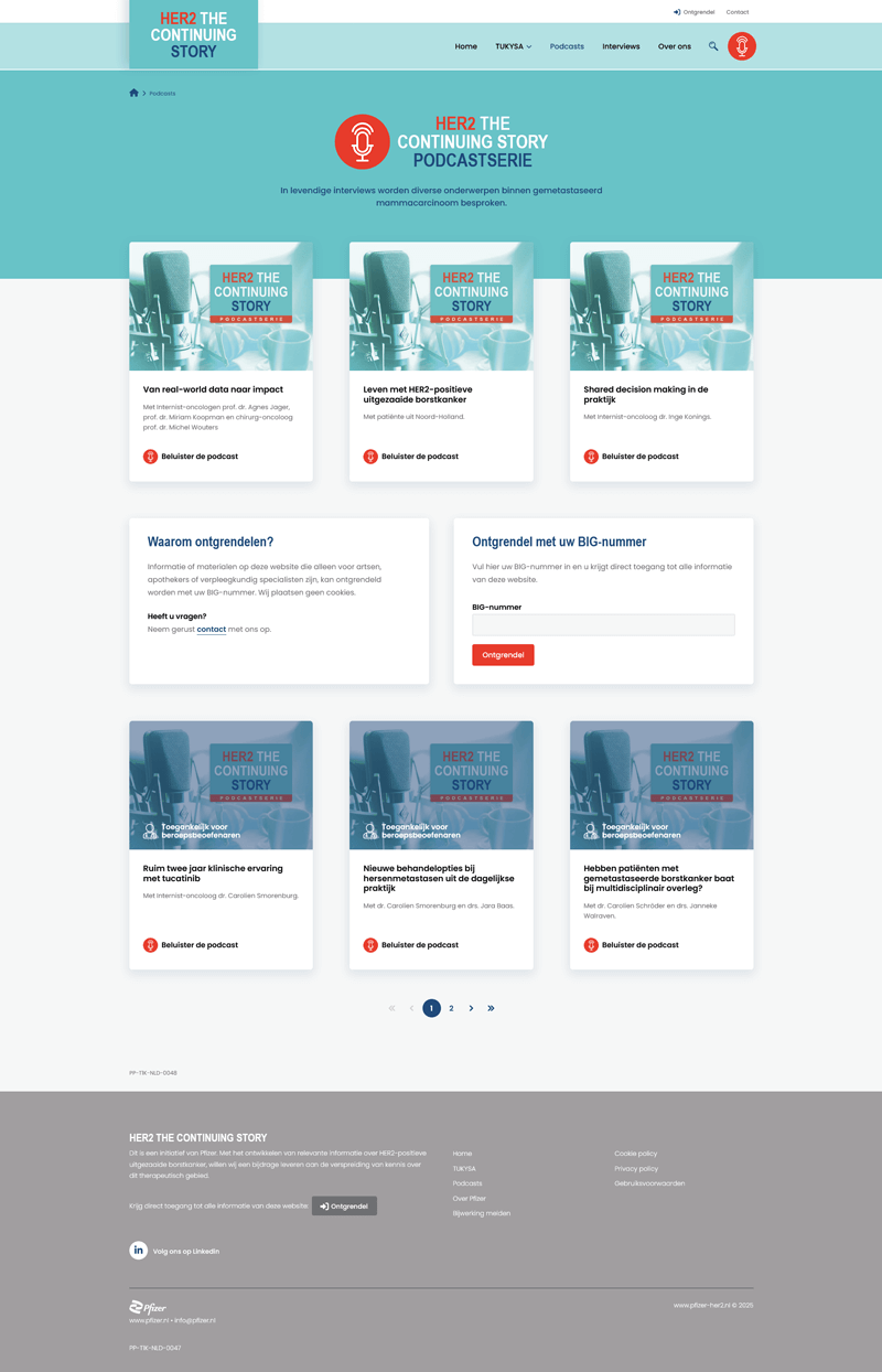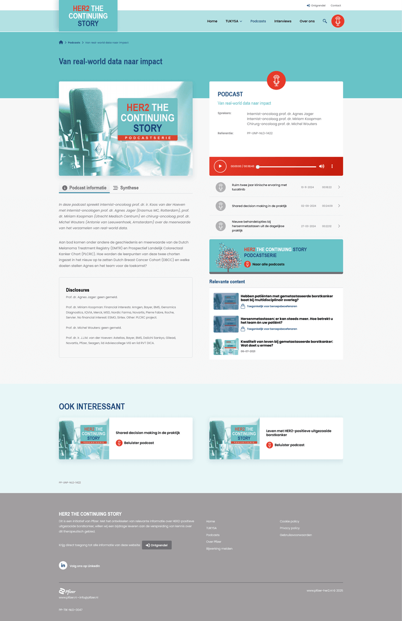 HER2 – The Continuing Story is een informatief online platform gericht op artsen en oncologisch specialisten. Het platform biedt actuele inzichten in de behandeling van gemetastaseerde borstkanker, met een sterke focus op kennisdeling via podcasts, artikelen en video’s. Het project is een initiatief van Seagen (inmiddels Pfizer), een internationaal biotechnologiebedrijf dat zich richt op innovatie binnen de kankerzorg.